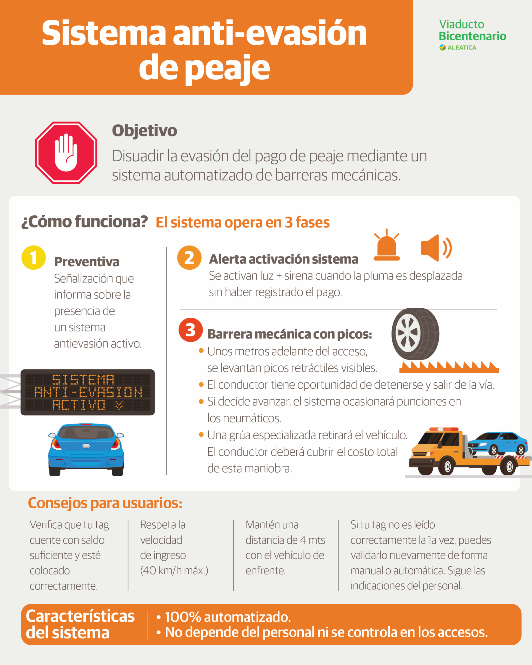 El sistema se activa cuando no se cuenta con una lectura válida del TAG, y se desplaza la pluma de acceso sin haber registrado el pago. Funciona en tres fases: